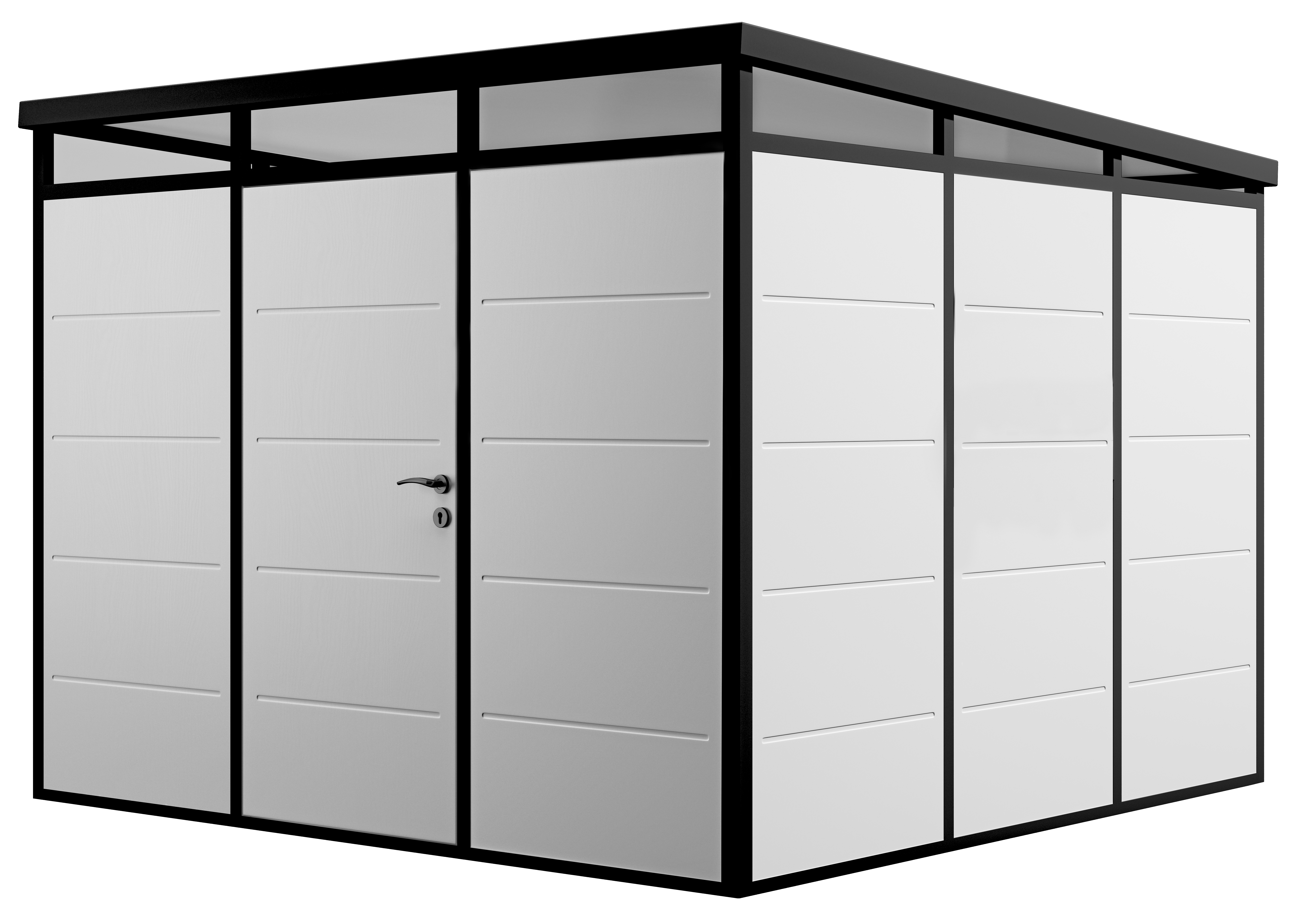 המחסן כולל חלונות סקיילייט מזכוכית מחוסמת, דלת איכותית עם מנעול צילינדר ורצפה פנימית מוגבהת