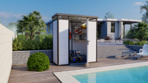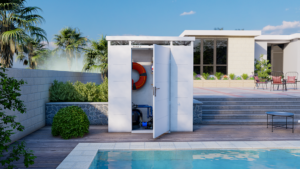 המחסן כולל חלונות סקיילייט מזכוכית מחוסמת, דלת איכותית עם מנעול צילינדר ורצפה פנימית מוגבהת