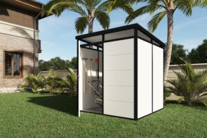 המחסן כולל חלונות סקיילייט מזכוכית מחוסמת, דלת איכותית עם מנעול צילינדר ורצפה פנימית מוגבהת